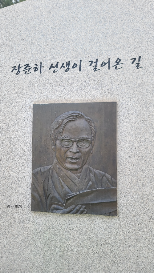 1918년 출생하셨고 1975년 8월 17일 별세하셨다. 독립운동가, 정치가, 언론인, 사회운동가, 종교인이셨다. 장준하 선생의 아버지 장석인(1901~1966)도 독립운동가이며 목사셨다. 장석인은 민주화 운동가로 유명하며 씨알의 소리라는 잡지로 유명한 함석헌 선생과 동갑이고 함석헌의 장남 함국용은 장준하선생과 같은 1918년 생이므로 이들의 동지애는 남달랐을 것으로 생각된다. 장준하 선생은 세계2차대전 말기인 1944년 일본신학교에서 수학하던 중 학도병으로 일본군에 끌려 갔다가, 6개월만에 탈출하여 독립군에 입대하게 된다. 광복군에 합류하기 위해 평생의 친구였던 김준엽 등과 함께 2,500KM를 약 7개월 동안 걸어서 대한민국임시정부가 있는 중경까지 갔다. 도중에 검문에 걸리지 않기 위해 중국 농부나 상인으로 변장하기도 하였다. 탈출 성공 직후에는 중국중앙군관학교 임천분교 한국광복군 간부 훈련반에 입대한다. 그러나 이곳 훈련의 한계를 느끼고 1945년 1월 30일 중경의 대한민국임시정부로 가게 되었다. 도착 후 서안의 한국광복군 제2지대 이범석 휘하에 배속되고, 유엔군 중국전구 사령부 웨드마이어 휘하에서 미국전략정보국이 주관하는 한미합작 특별군사훈련(OSS, Office of Strategic Service)을 받았다. 한국 후방 침투를 목적으로 조직된 국내정진군에 자원하여 수송기를 타고 작전에 투입되었으나 일본의 항복으로 귀환하였다. 그후 1945년 12월 대한민국 임시정부 주석 김구의 비서 자격으로 귀국하였다. 1946년 한국신학대학에 입학하였고, 1953년에는 사상계라는 잡지를 창간하였다. 사후에 건국훈장 애국장이 추서되었다.
