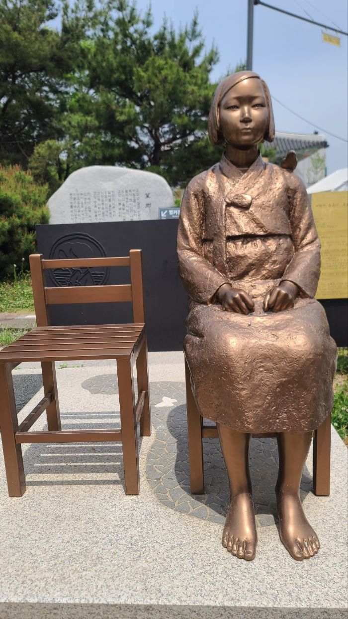 평화의 소녀상은 일본군 위안부들을 기리기 위한 조형물이다. 2차 세계대전 중 일본군에 의한 야만행위에 항의하기 위한 1000번째 수요 집회인 2011년 12월 14일에 일본 대사관 앞에 처음으로 설치 되었다. 강제로 끌려가 위안부가 되신 분들은 이미 고인이 되었거나 할머니 들이다. 빈 의자는 고인이 되신 위안부 할머니들의 자리이며, 그들이 꽃다운 나이에 끌려갔으므로 소녀로 표현되었다. 소녀는 한복 치마 저고리를 입고 있으며 의자에 단정하게 앉아있다. 얼굴은 둥글고 쌍꺼플은 없으나 일자로 굳게 다문 입과 주먹진 손은 결연한 의지, 저항의 모습을 보여주고 있다. 눈빛은 똑바로 상대방을 처다보면서 '너희들이 한 행동을 봐라'하며 반성을 촉구하고 있는 듯 하다. 단발머리의 끝을 자세히 보면 가지런하지 않은데 이는 일본군에 의해 댕기머리가 강제로 잘려나간 것을 의미한다. 소녀는 맨발이며 뒷꿈치를 들고 있다. 신발도 못신고 급하게 끌려왔고, 땅에 온전하게 발 디디며 뿌리내리고 살 수 없었던 위안부의 슬픔을 표현하고 있는 듯하다. 소녀의 왼쪽어깨에 새가 한마리 앉아 있다. 하늘과 인간세계를 매개하는 새, 하늘을 자유롭게 날으며 평화를 상징하는 비둘기로 생각되었다. 소녀상 바닥의 그림자는 할머니 모습이고 나비가 한마리 날고 있다. 소녀가 세월에 따라 할머니가 되고, 나비는 환생과 꿈을 표현하고 있다. 이 조형물을 보면 전쟁과 인권에 대하여 생각하게 되고, 할머니들의 꿈많았을 소녀시절이 일본군에 의해 무참하게 짙밟힌 것을 생각하면, 가슴이 무척 아프다.
